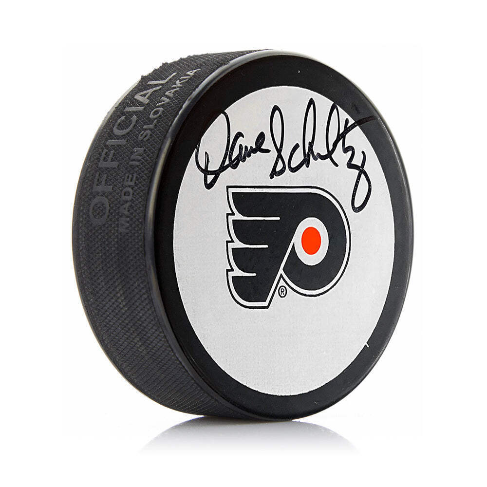 Dave 'The Hammer' Schultz Philadelphia Flyers Autographed White Hockey Logo Puck Official NHL logo puck with signature from Flyers great Dave Schultz - authenticated by Dynasty Sports This officially licensed hockey puck has been signed by Philadelphia Flyers legendary enforcer Dave Schultz. It has been authenticated by Dynasty Sports. Hand-Signed by Philadelphia Flyers great Dave Schultz Signature is bold and clear on the puck Authenticated by Dynasty Sports serially numbered hologram Official NHL puck Custom framing options available - contact our storefront for information regarding customizing this in the frame and matting colors of your choice! Add a nameplate and team logo medallions! Please allow additional time for framing and shipping.