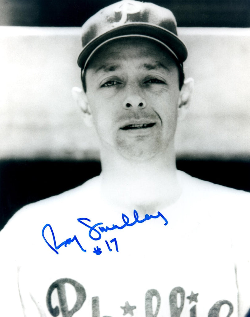 An 8x10 hand signed photo of former Philadelphia Phillies ROY SMALLEY. The signature is Mint in BLUE sharpie. SMALLEY was a member of the Phillies from 1955-58. This photo was signed at a private signing and would make a great addition to any PHILLIES collection! This item is guaranteed to be 100% authentic and will include a store COA with our matching Tamper Proof Holograms.