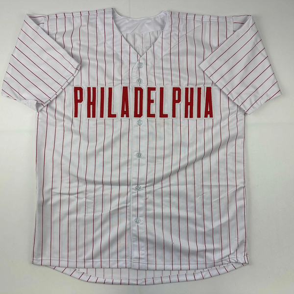 Autographed/Signed Jonathan Papelbon Philadelphia Pinstripe Jersey JSA COA Jersey has no brand names or logos. This is a custom jersey and was not manufactured by or in any manner associated with any professional sports league or manufacturer. This custom jersey carries no professional sports league designation. The item is intended to be an autographed collectible. The custom jersey displays the name and number of the player. This item in no way is affiliated with or connected to any professional sports organization. Size is XL.