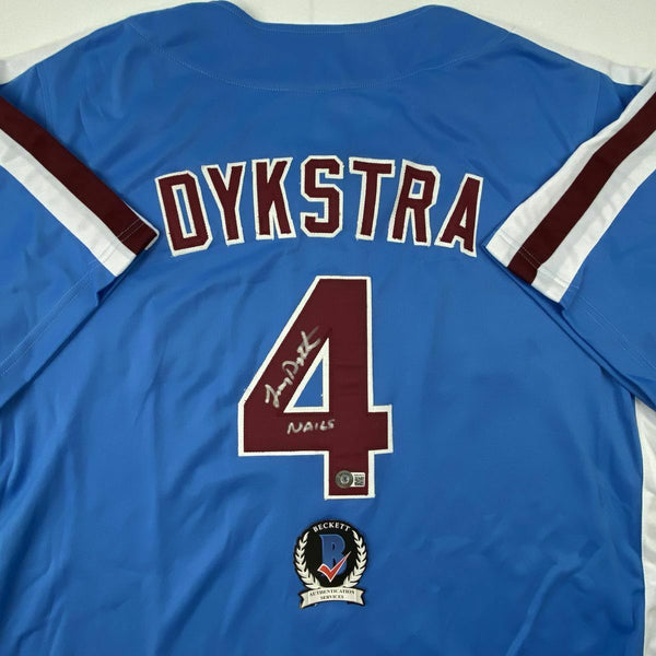 Autographed/Signed LENNY DYKSTRA Nails Philadelphia Blue Retro Jersey JSA COA This is a custom jersey and was not manufactured by or in any manner associated with any professional sports league or manufacturer. This custom jersey carries no professional sports league designation. The item is intended to be an autographed collectible. Reference of team in the title is to allow the purchaser a point of association. The custom jersey displays the name, number and authenticated signature of the player. This item in no way is affiliated with or connected to any professional sports organization. The autograph, as always is guaranteed to be authentic and has been certified as authentic by a third-party, trusted authenticator. Size is XL unless otherwise noted.