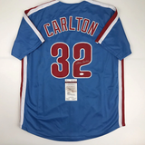 Autographed/Signed Steve Carlton Philadelphia Retro Blue Baseball Jersey JSA COA Jersey has no brand names or logos. This is a custom jersey and was not manufactured by or in any manner associated with any professional sports league or manufacturer. This custom jersey carries no professional sports league designation. The item is intended to be an autographed collectible. The custom jersey displays the name and number of the player. This item in no way is affiliated with or connected to any professional sports organization. Size is XL.