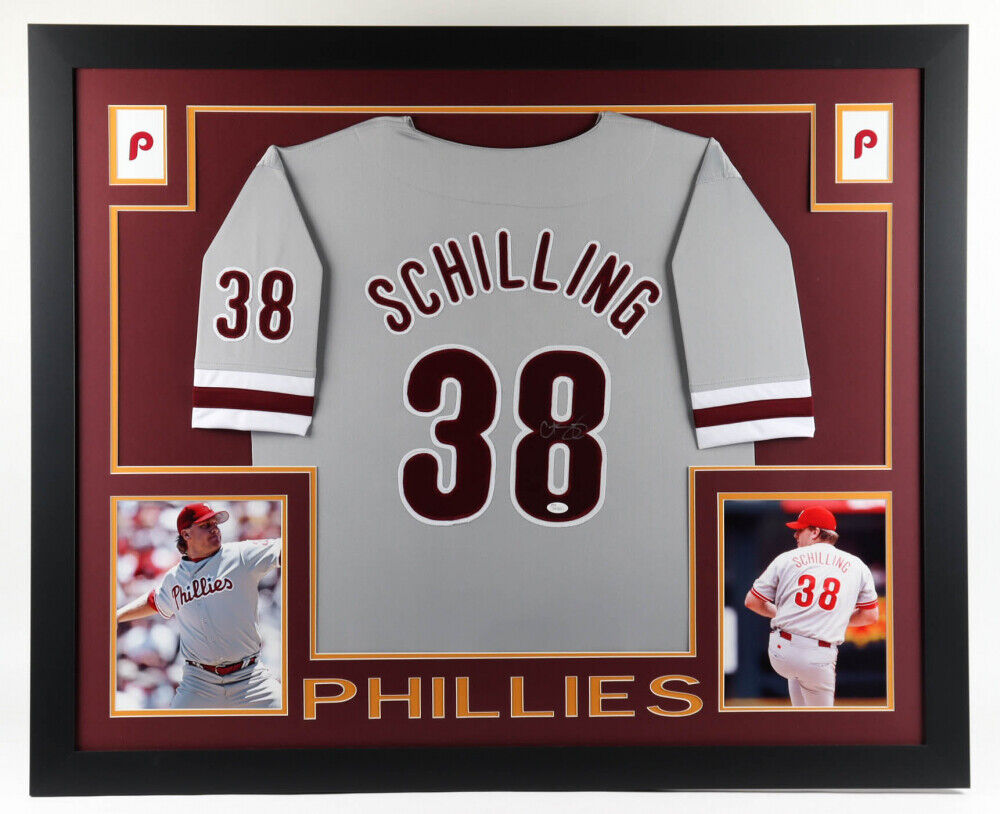 Custom frame measures approximately 35" x 43" in size and features a custom on-field style jersey that has been hand-signed by Curt Schilling.The lot / autograph(s) includes an official James Spence Authentication (JSA) hologram for authenticity purposes. The signing of this item was witnessed by JSA.Authentication: JSA Hologram