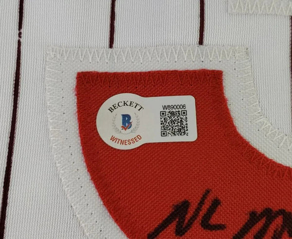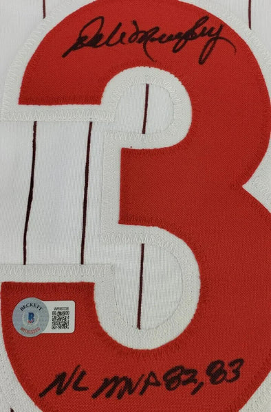 This autographed jersey has been personally hand-signed by Dale Murphy ("NL MVP 82, 83" inscription) of the Philidelphia Phillies.This autograph is certified by Beckett Authentication Services (BAS) Witness Certification. That means that a Beckett representative was present when this item was signed. It comes with the numbered authentication hologram with a QR code that verifies the authentication on the Beckett website.Custom on-field style jerseys are a more affordable option for autograph seekers. These jerseys do not have any brand name or tags and are made in the Philippines. They feature stitched on names and numbers and are made to look very similar to the on-field jerseys that the players wear. These custom jerseys are very commonly used in the memorabilia industry.