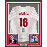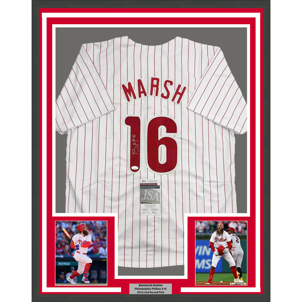 Framed Autographed/Signed Brandon Marsh 35x39 Pinstripe Jersey JSA COA The item is professionally framed and matted with two 5x7 photos, measures 35x39 inches and is ready to be hung in your man cave! Photo and matting requests can be made.
