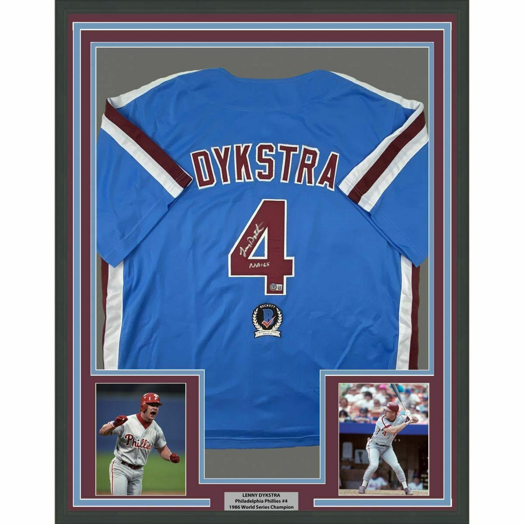 FRAMED Autographed/Signed LENNY DYKSTRA Nails 33x42 Blue Retro Jersey JSA COA The item is professionally framed & matted with two 8x10 photos, measures 33"x42" and is ready to be hung in your man cave! NOTE: COA card will be mounted on the back of the frame, not inside it on top of the jersey as seen in the picture.