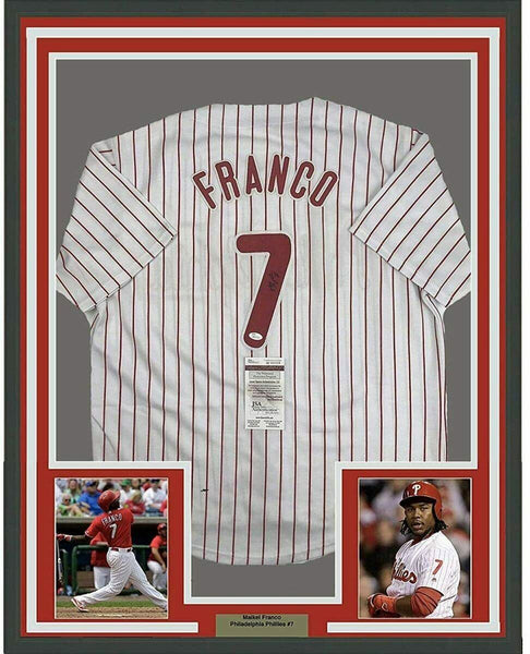 Framed Autographed/Signed Maikel Franco 33x42 Philly Pinstripe Jersey JSA COA The item is professionally framed & matted with two 8x10 photos, measures 33"x42" and is ready to be hung in your man cave! NOTE: COA card will be mounted on the back of the frame, not inside it on top of the jersey as seen in the picture.