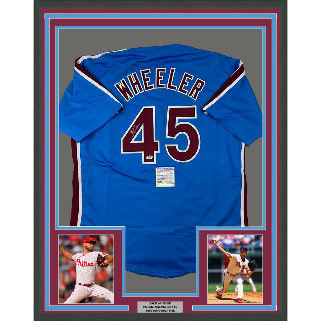 Framed Autographed/Signed Zack Wheeler 33x42 Blue Retro Jersey PSA/DNA COA The item is professionally framed & matted with two 5x7 photos, measures 33"x42" and is ready to be hung in your man cave! NOTE: COA card will be mounted on the back of the frame, not inside it on top of the jersey as seen in the picture.