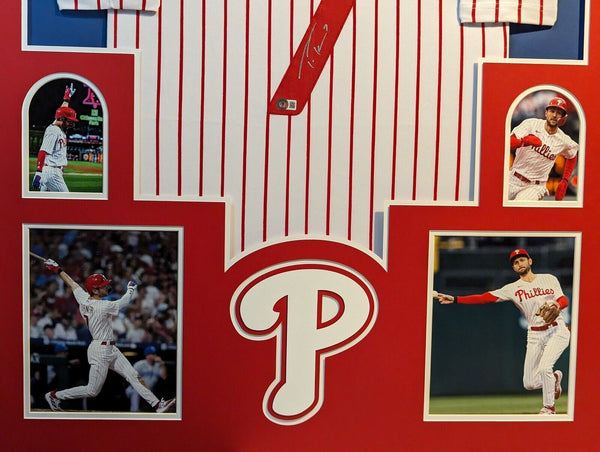 Custom Framed Trea Turner hand signed Philadelphia Phillies style custom jersey.Beckett HologramThe authentication is from Beckett. This signature is WITNESSED by a representative of Beckett! 100% AUTHENTIC!!! The jersey has fully stitched numbers on the front and back. It is a great item and a must for all great sports fans!This item is professionally framed, it measures 32"x40" inside , 42"x34" outside , using UV protective Acrylic glass for safe keeping and safe transport, team color matting, black moulding and hanging hooks on the back. All additional items in frame seen in pictures included. 100% ready to hang in your fan cave.