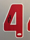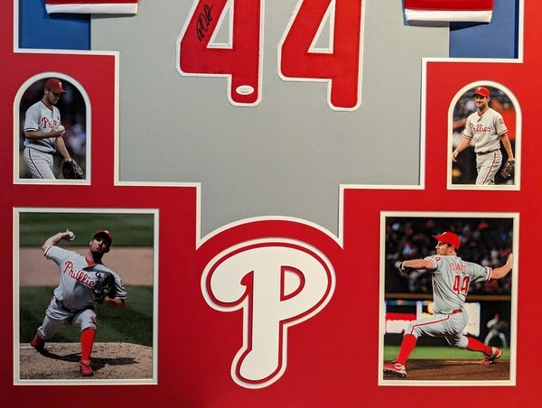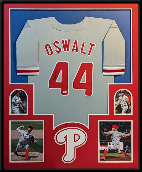 Custom Framed Roy Oswalt hand signed Philadelphia Phillies style custom jersey.JSA Hologram and COAThe authentication is from JSA. This signature is WITNESSED by a representative of JSA! 100% AUTHENTIC!!! The jersey has fully stitched numbers on the front and back. It is a great item and a must for all great sports fans!This item is professionally framed, it measures 32"x40" inside , 42"x34" outside , using UV protective Acrylic glass for safe keeping and safe transport, team color matting, black moulding and hanging hooks on the back. All additional items in frame seen in pictures included. 100% ready to hang in your fan cave.