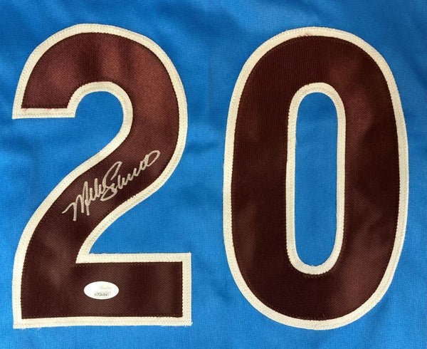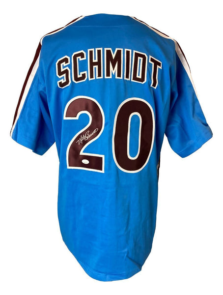 Featured is a Mike Schmidt signed custom baseball jersey. This jersey has been hand signed by Schmidt and comes with the JSA hologram. This jersey features professionally sewn letters and numbers and is size XL. This jersey has no team tags or emblems and is intended as a sports collectible. This jersey would make a great addition to any sports memorabilia collection!. SPECIFICATIONS Autographed By: Mike Schmidt Team: Philadelphia Phillies Sport: Baseball Authentication: James Spence Authentication (JSA)