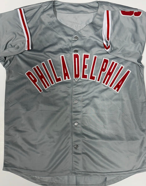 Custom Replica Grey Jersey of Philadelphia Phillies MVP First Baseman RYAN HOWARD. This jersey is signed with Black sharpie. The jersey is size XL with all letters and numbers sewn in. This item was signed at a private signing with us and would make a great addition to any Phillies collection. This autograph is guaranteed to be 100% authentic and will include a COA from Beckett Authentication.