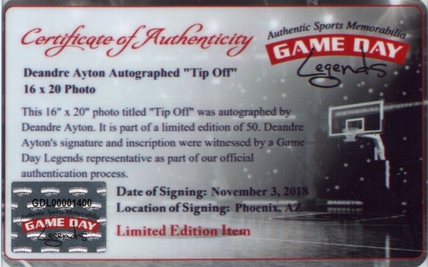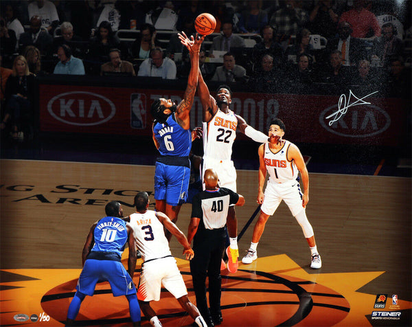 DEANDRE AYTON Autographed Phoenix Suns "Tip Off" 16" x 20" Photograph - Limited Edition of 50 - Super Sports Center & Steiner Sports Authenticated This photograph was autographed by Deandre Ayton. It is officially licensed by the National Basketball Association and comes with an individually numbered, tamper-evident hologram from Super Sports Center Authenticated as well as Steiner Sports Authentic. Your signed item can be identified and verified for authenticity by entering the serial number from your hologram into our online database. This process confirms and guarantees that your collectible is authentic and eliminates all possibility of duplication and fraud.This product is guaranteed authentic and includes a Super Sports Center Certificate of Authenticity and an accompanying tamper-evident hologram.