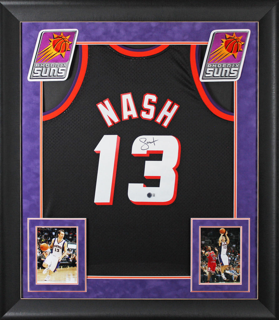 This Autographed Black Mitchell & Ness 1996-97 Hardwood Classics Swingman Framed Jersey has been Personally Signed by Steve Nash of the Phoenix Suns. This item is 100% Authentic to include a hologram by Beckett Authentication Services. This item will come with an affixed Beckett Authentication Services (BAS) authentication sticker, which includes a scannable QR code to verify authenticity. Please note that Beckett no longer provides serial-numbered COA cards, and the attached BAS sticker will serve as the complete authentication for this item. This is a BAS Witnessed Protection Program item which means a Beckett Authentication Service representative was present when this item was being signed. We conducted an autograph signing with Steve Nash where multiples of the same item were signed. While the photographs are representative of this item, the size, placement and strength of the signature may vary. Each item is hand signed, therefore, each autograph is unique. This item can be verified through BAS Witnessed. This item has been professionally framed to overall dimensions of approximately 32 x 37 inches. This is a X-Large sized Framed Jersey. This jersey will be framed to order, it will take 3-4 days from purchase date for it to ship.