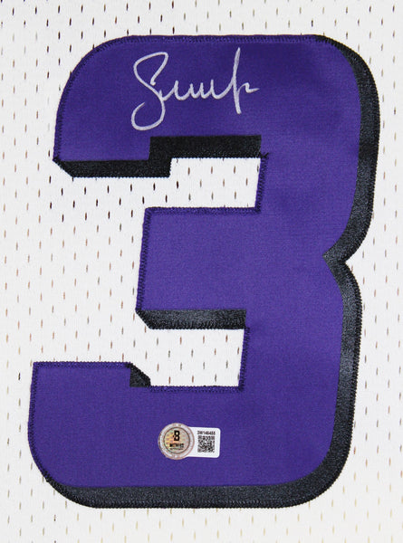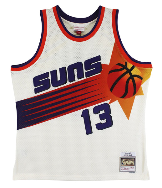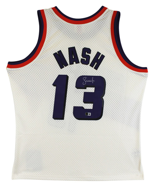 This Autographed Cream Mitchell & Ness 1996-97 Hardwood Classics Swingman Jersey has been Personally Signed by Steve Nash of the Phoenix Suns. This item is 100% Authentic to include a hologram by Beckett Authentication Services. This item will come with an affixed Beckett Authentication Services (BAS) authentication sticker, which includes a scannable QR code to verify authenticity. Please note that Beckett no longer provides serial-numbered COA cards, and the attached BAS sticker will serve as the complete authentication for this item. This is a BAS Witnessed Protection Program item which means a Beckett Authentication Service representative was present when this item was being signed. We conducted an autograph signing with Steve Nash where multiples of the same item were signed. While the photographs are representative of this item, the size, placement and strength of the signature may vary. Each item is hand signed, therefore, each autograph is unique. This item can be verified through BAS Witnessed. This is a X-Large sized Jersey.