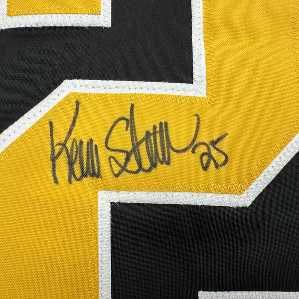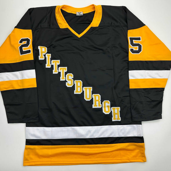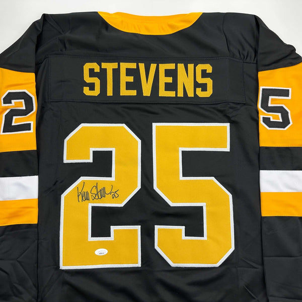 Autographed/Signed Kevin Stevens Pittsburgh Black Hockey Jersey JSA COA Jersey has no brand names or logos. This is a custom jersey and was not manufactured by or in any manner associated with any professional sports league or manufacturer. This custom jersey carries no professional sports league designation. The item is intended to be an autographed collectible. The custom jersey displays the name and number of the player. This item in no way is affiliated with or connected to any professional sports organization. Size is XL.
