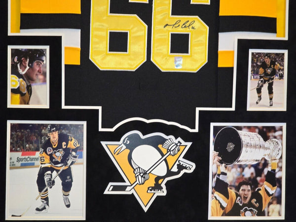 Custom Framed in SUEDE Mario Lemieux hand signed Pittsburgh Penguins style custom jersey. Frameworth Hologram The authentication is from Frameworth. This signature is WITNESSED by a representative of Frameworth! 100% AUTHENTIC!!! The jersey has fully stitched numbers on the front and back. It is a great item and a must for all great sports fans! This item is professionally framed, it measures 32"x40" inside , 42"x34" outside , using UV protective Acrylic glass for safe keeping and safe transport, SUEDE team color matting, black moulding and hanging hooks on the back. All additional items in frame seen in pictures included. 100% ready to hang in your fan cave.