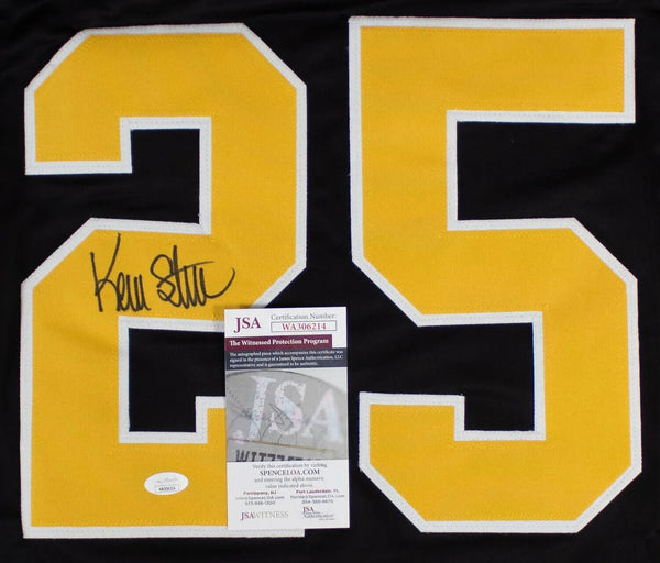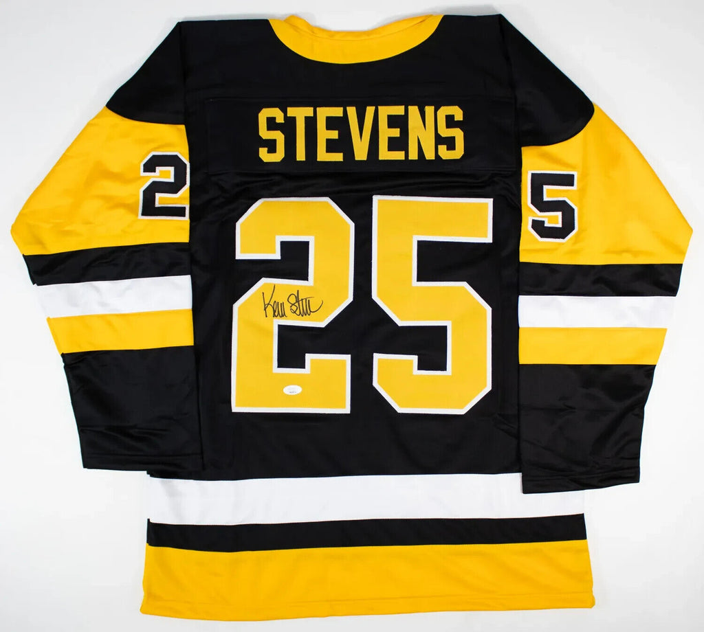 Custom on-ice style jersey. Everything sewn on, size XL. Hand-signed by Kevin Stevens.This autograph is certified by James Spence Authentication's (JSA) Witnessed Protection Program. That means that a JSA representative was present when this item was signed. It comes with the numbered hologram and matching Certificate of Authenticity.Custom on-field style jerseys are a more affordable option for autograph seekers. These jerseys do not have any brand name or tags and are made in the Philippines. They feature stitched on names and numbers and are made to look very similar to the on-field jerseys that the players wear. These custom jerseys are very commonly used in the memorabilia industry.