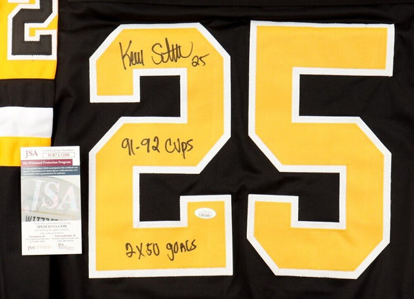 Custom on-ice style jersey. Everything sewn on, size XL. Hand-signed by Kevin Stevens.This autograph is certified by James Spence Authentication's (JSA) Witnessed Protection Program. That means that a JSA representative was present when this item was signed. It comes with the numbered hologram and matching Certificate of Authenticity.Custom on-field style jerseys are a more affordable option for autograph seekers. These jerseys do not have any brand name or tags and are made in the Philippines. They feature stitched on names and numbers and are made to look very similar to the on-field jerseys that the players wear. These custom jerseys are very commonly used in the memorabilia industry.