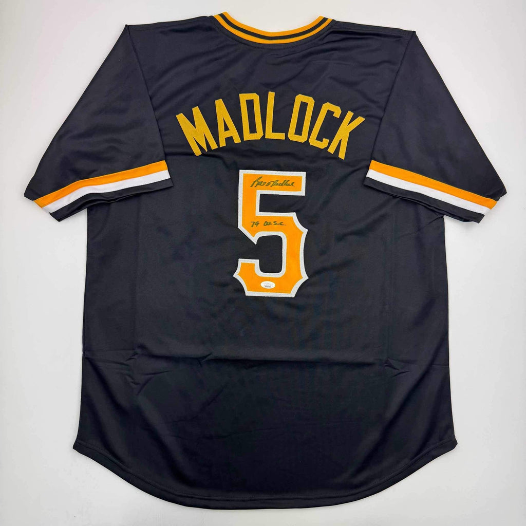 Autographed/Signed Bill Madlock Pittsburgh Black Baseball Jersey JSA COA Jersey has no brand names or logos. This is a custom jersey and was not manufactured by or in any manner associated with any professional sports league or manufacturer. This custom jersey carries no professional sports league designation. The item is intended to be an autographed collectible. The custom jersey displays the name and number of the player. This item in no way is affiliated with or connected to any professional sports organization. Size is XL.