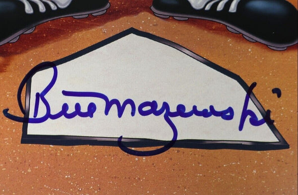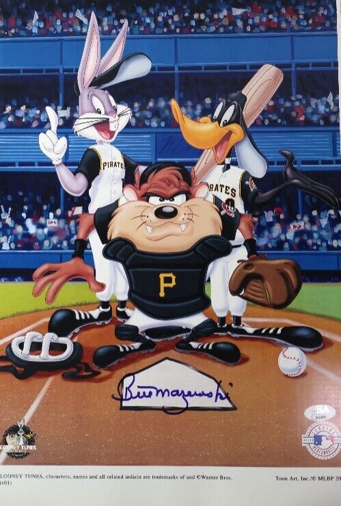 The product is an original lithograph featuring Bugs Bunny, Daffy Duck, and the Tasmanian Devil and autographed by Bill Mazeroski, the Hall of Famer for the Pittsburgh Pirates. The autograph has been authenticated by James Spence Authentication (JSA), ensuring its authenticity. This unique piece of memorabilia would be a perfect addition to any baseball fan's collection, showcasing a piece of baseball history with a touch of nostalgia for the Pirates franchise.