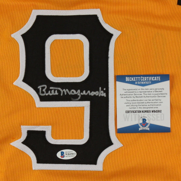 Custom on-field style jersey. Everything is sewn on, size XL. Has been hand-signed by Bill Mazeroski (Pittsburgh Pirates, HOF). The lot / autograph(s) includes an official Beckett Authentication Services serially-numbered hologram and matching COA.Authentication: Beckett COA