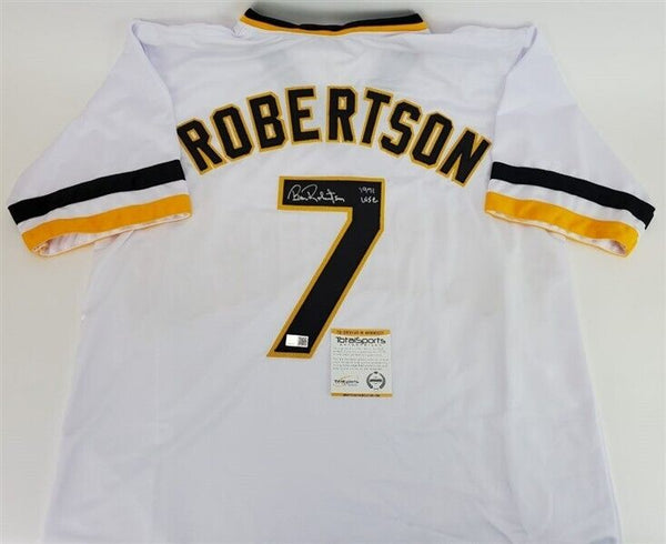 This autographed jersey has been personally hand-signed by Bob Robertson ("1971 WSC" inscription) of the Pittsburgh Pirates. This autograph is certified by Total Sports Enterprises (TSE). It comes with the Total Sports Enterprises authentication hologram and Certificate of Authenticity.Custom on-field style jerseys are a more affordable option for autograph seekers. These jerseys do not have any brand name or tags and are made in the Philippines. They feature stitched on names and numbers and are made to look very similar to the on-field jerseys that the players wear. These custom jerseys are very commonly used in the memorabilia industry.