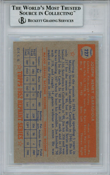 Joe Garagiola Autographed 1983 Topps 1952 Reprint #227 Card Beckett Slab 38445 The number in the listing title is just an inventory sku for our records and is not the authentication number. This is the exact item that you will receive so please see pictures for condition. This is a trading card that was personally autographed by Joe Garagiola. This has been professionally slabbed by Beckett Authentication Services (BAS) and includes a certificate of authenticity from Denver Autographs.