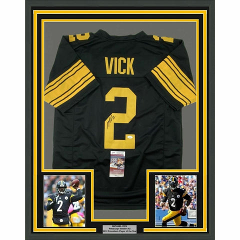 FRAMED Autographed/Signed MICHAEL MIKE VICK 33x42 Pittsburgh BB Jersey PSA COA
