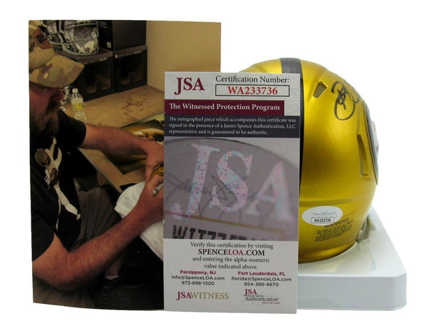 Brett Keisel Autographed Gold Mini Flash Football Helmet Pittsburgh Steelers. This helmet is authenticated by JSA and includes their tamper-proof hologram sticker and Certificate of Authenticity.