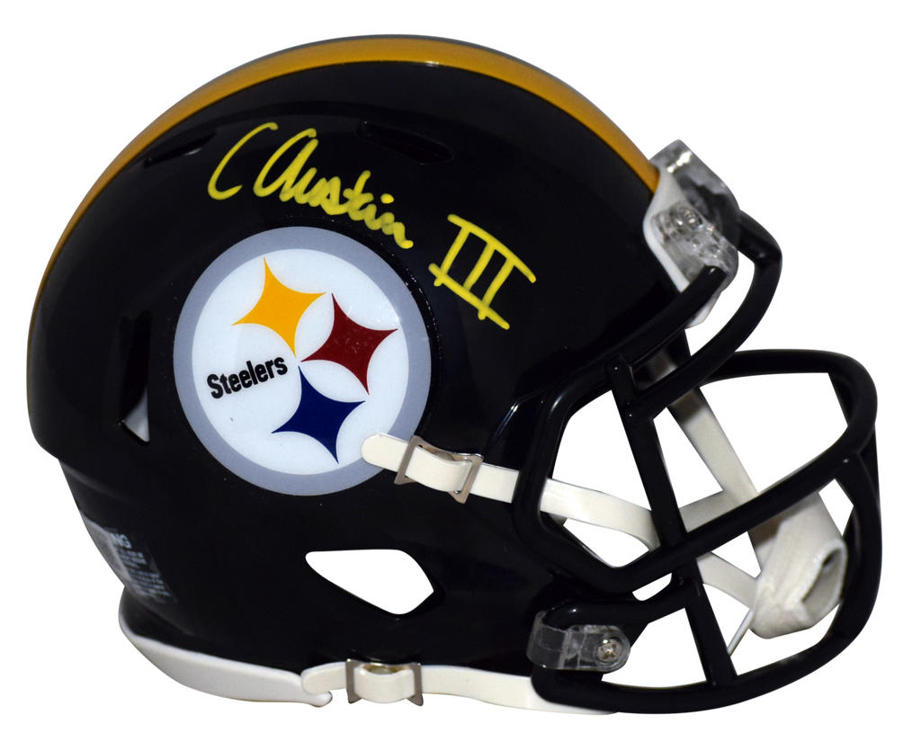 Calvin Austin III, star wide receiver for the Pittsburgh Steelers, has hand signed this Steelers Riddell Speed mini helmet at a private signing. This item is authenticated by Beckett Authentication Services and was signed in the presence of one of their representatives. Their tamper-evident hologram featuring a QR code and serial number is on the item. The authenticity can be verified online by entering the serial number or scanning the QR code.Item pictured may not be the exact item you will receive. It will be similar quality, and we guarantee your satisfaction.