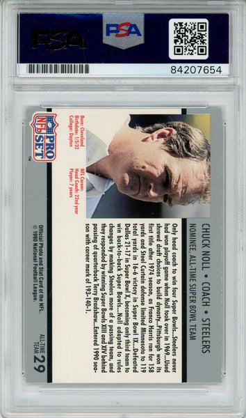 Chuck Noll Signed 1990 Pro Set #29 Trading Card PSA Slab 42630 The number in the listing title is just an inventory sku for our records and is not the authentication number. This is the exact item that you will receive so please see pictures for condition. This is a trading card that has been personally autographed by Chuck Noll. This has been professionally slabbed by Professional Sports Authentication (PSA) and includes a certificate of authenticity from Denver Autographs.
