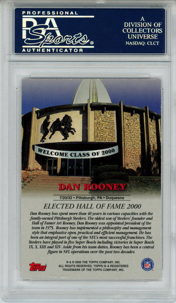 Dan Rooney Autographed/Signed 2000 Topps Trading Card PSA Slab 43736 The number in the listing title is just an inventory sku for our records and is not the authentication number. This is the exact item that you will receive so please see pictures for condition. This is a trading card that was personally autographed by Dan Rooney with HOF inscription. This has been professionally slabbed by Professional Authentication Services (PSA) and includes a certificate of authenticity from Denver Autographs.