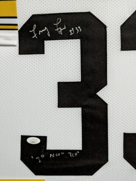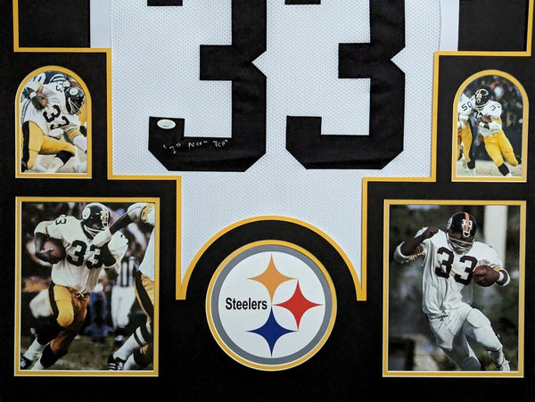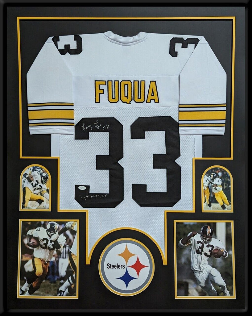 Custom Framed John "Frenchie" Fuqua hand signed Pittsburgh Steelers style custom jersey."I'll Never Tell" InscribedJSA Hologram and COAThe authentication is from JSA. This signature is authenticated by a representative of JSA! 100% AUTHENTIC!!! The jersey has fully stitched numbers on the front and back. It is a great item and a must for all great sports fans!This item is professionally framed, it measures 32"x40" inside , 42"x34" outside , using UV protective Acrylic glass for safe keeping and safe transport, team color matting, black moulding and hanging hooks on the back. All additional items in frame seen in pictures included. 100% ready to hang in your fan cave.