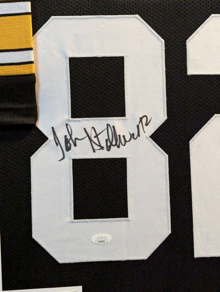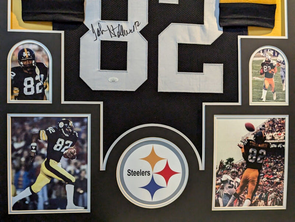 Custom Framed John Stallworth hand signed Pittsburgh Steelers style custom jersey.JSA Hologram and COAThe authentication is from JSA. This signature is WITNESSED by a representative of JSA! 100% AUTHENTIC!!! The jersey has fully stitched numbers on the front and back. It is a great item and a must for all great sports fans!This item is professionally framed, it measures 32"x40" inside , 42"x34" outside , using UV protective Acrylic glass for safe keeping and safe transport, team color matting, black moulding and hanging hooks on the back. All additional items in frame seen in pictures included. 100% ready to hang in your fan cave.
