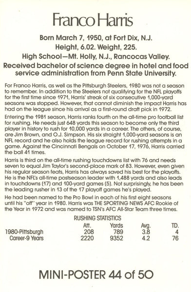 The number in the listing title is just an inventory sku for our records and is not the authentication number. This is a stock photo of the item that you will receive. This is a mini poster measuring 8.5" x 5.5" that was personally autographed by Franco Harris. Includes a certificate of authenticity from Beckett Authentication Services (BAS) and Denver Autographs.