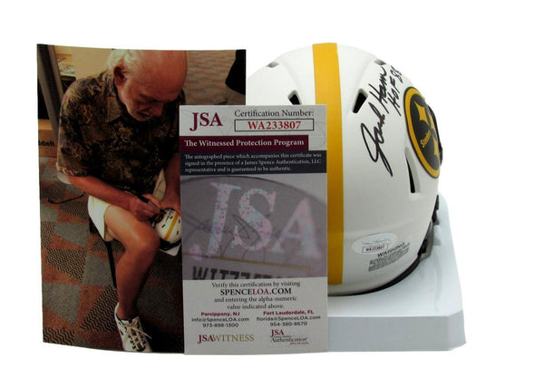 Jack ham hof autographed/inscribed "hof 88" white mini lunar eclipse football helmet pittsburgh steelers. this helmet is authenticated by jsa and includes their tamper-proof hologram sticker and certificate of authenticity.