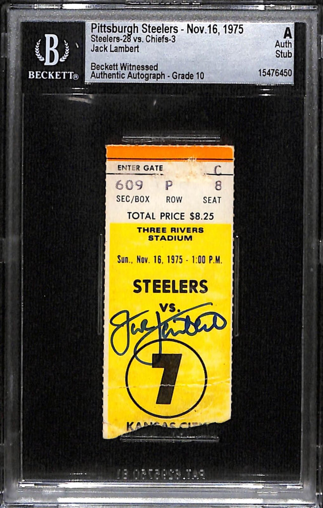 Jack Lambert Signed Pittsburgh Steelers 11/16/75 Ticket Stub Slab Beckett 38402 The number in the listing title is just an inventory sku for our records and is not the authentication number. The item pictured is a stock photo unless otherwise noted. This is a Pittsburgh Steelers 11/16/1975 Slabbed Ticket Stub that was personally autographed by Jack Lambert. Includes a certificate of authenticity from Beckett Authentication Services (BAS) and Denver Autographs.