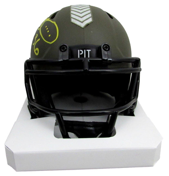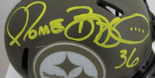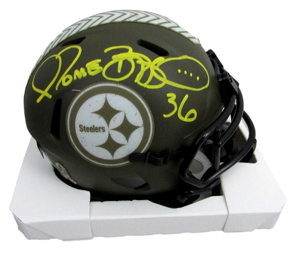 Jerome Bettis HOF Autographed Mini Salute To Service Helmet Pittsburgh Steelers. This helmet is authenticated by BAS/Beckett and includes their Tamper-proof Hologram Sticker and Certificate of Authenticity.