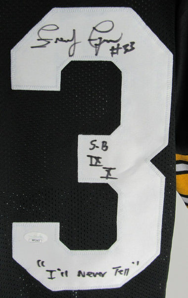 John Frenchy Fuqua Signed/Inscribed "S-B IX X I'll Never Tell" Pittsburgh Steelers Black Custom Football Jersey Size XL. This jersey is authenticated by JSA and includes their Tamper-proof Sticker and Certificate of Authenticity.