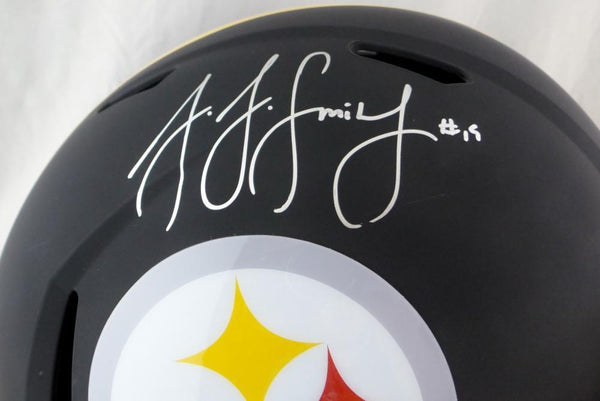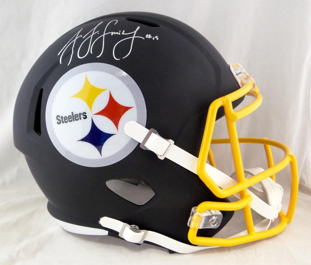 JuJu Smith-Schuster Autographed Steelers F/S Flat Black Helmet- JSA W Auth *Silver This is a Hand Autograph of JuJu Smith-Schuster of the Pittsburgh Steelers on a Full Size Riddell Football Flat Black Replica Helmet. This item has a James Spence Witness Authentication, which comes with a JSA #'ed sticker and a matching JSA Certificate of Authenticity. You can view this item on the SpenceLOA website and it shows when and where the item was signed. It was signed either at a public autograph appearance or a private signing. This is a stock photo of the item. Although you may not receive this exact item, the item you receive is virtually identical and brand new in great shape.