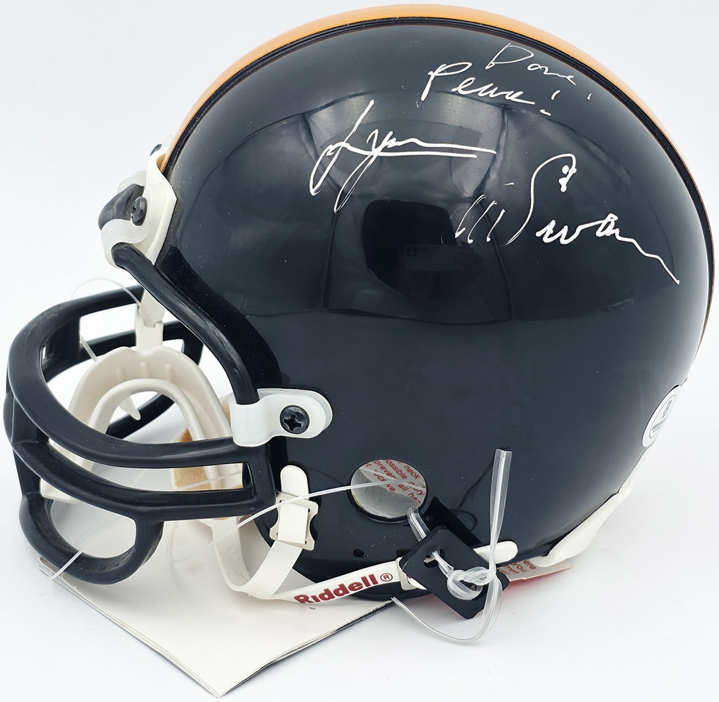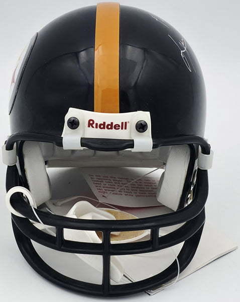 This is a Pittsburgh Steelers Black Mini Helmet that has been hand signed by Lynn Swann. This item was inscribed "Dave, Peace!." This item has been certified authentic by Beckett Authentication (BAS) and comes with their tamper-proof QR Code hologram.