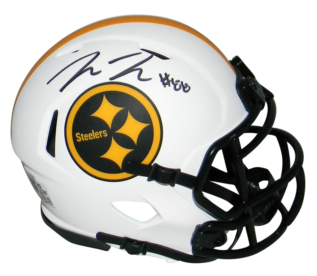 Pat Freiermuth, star tight end for the Pittsburgh Steelers, has hand signed this Steelers Riddell Speed Lunar mini helmet at a private signing. This item is authenticated by Beckett Authentication Services, one of the best authenticators in the industry. Their tamper-evident hologram featuring a QR code and serial number is on the item. The authenticity can be verified online by entering the serial number or scanning the QR code.Item pictured may not be the exact item you will receive. It will be similar quality, and we guarantee your satisfaction.