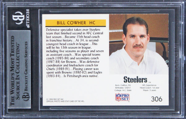 This Autographed 1992 Pro Set #306 Card has been Personally Signed by Bill Cowher of the Pittsburgh Steelers. This item is 100% Authentic, it comes slabbed and authenticated by Beckett Authentication Services. The authenticity can be verified on Beckett Authentication Services website.