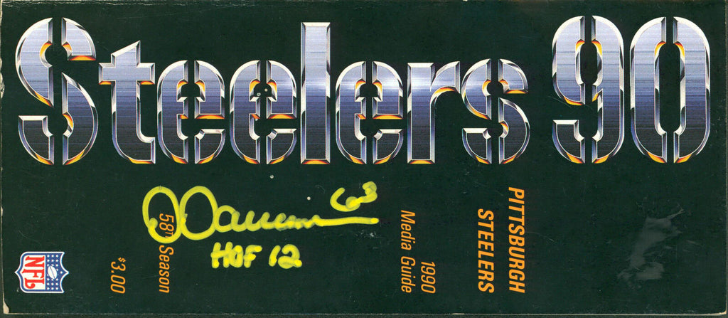 This Autographed 1990 Media Guide with the inscription of "HOF 12" has been Personally Signed by Dermontti Dawson of the Pittsburgh Steelers. This item is 100% Authentic to include a hologram by Beckett Authentication Services. This item will come with the new Beckett Authentication hologram that has a scannable QR code rather than the traditional COA. If you would like to have a COA, you are welcome to reach out to Beckett for a printed certification once you receive your item. This is a BAS Witnessed Protection Program item which means a Beckett Authentication Service representative was present when this item was being signed. The authenticity can be verified on Beckett Authentication Services website.