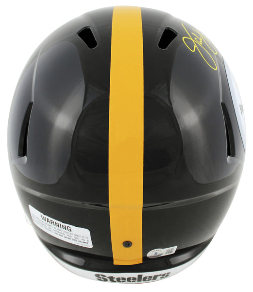 This Autographed Full Size Speed Rep Helmet with the inscription of "HOF 90" has been Personally Signed by Jack Lambert of the Pittsburgh Steelers. This item is 100% Authentic to include a hologram by Beckett Authentication Services. This item will come with an affixed Beckett Authentication Services (BAS) authentication sticker, which includes a scannable QR code to verify authenticity. Please note that Beckett no longer provides serial-numbered COA cards, and the attached BAS sticker will serve as the complete authentication for this item. This is a BAS Witnessed Protection Program item which means a Beckett Authentication Service representative was present when this item was being signed. We conducted an autograph signing with Jack Lambert where multiples of the same item were signed. While the photographs are representative of this item, the size, placement and strength of the signature may vary. Each item is hand signed, therefore, each autograph is unique. This item can be verified through BAS Witnessed.