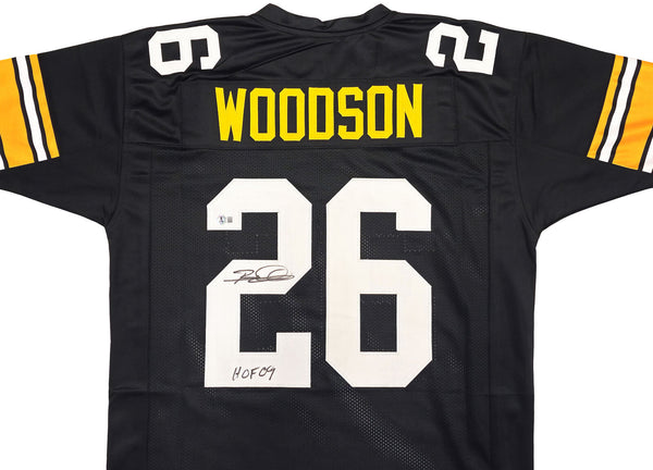 STEELERS ROD WOODSON AUTOGRAPHED BLACK JERSEY "HOF 09" BECKETT WITNESS 229996
