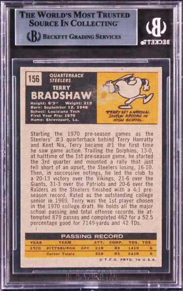 This Autographed 1971 Topps #156 Rookie Card has been Personally Signed by Terry Bradshaw of the Pittsburgh Steelers. This item is 100% Authentic, it comes slabbed and authenticated by Beckett Authentication Services. The authenticity can be verified on Beckett Authentication Services website.