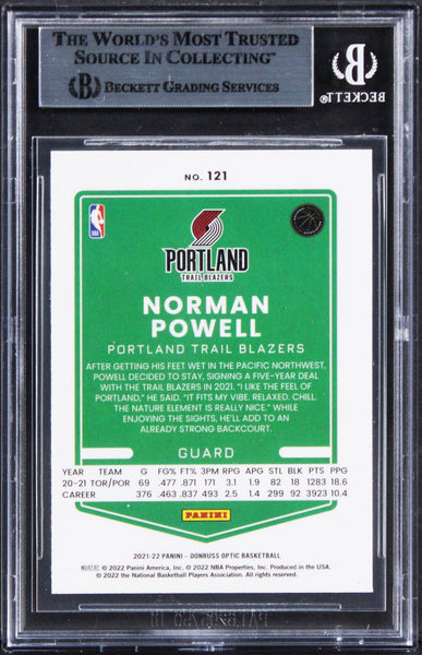 This Autographed 2021 Donruss Optic #121 Card has been Personally Signed by Norman Powell of the Portland Trail Blazers. This item is 100% Authentic, it comes slabbed and authenticated by Beckett Authentication Services. The authenticity can be verified on Beckett Authentication Services website.