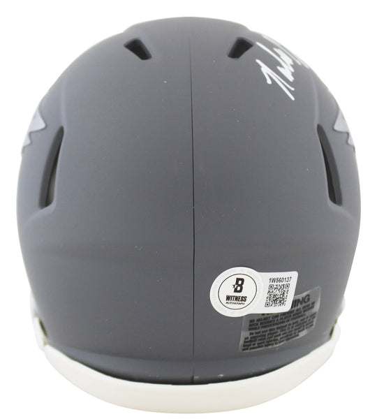 This Autographed Alternate Slate Speed Mini Helmet has been Personally Signed by Randall Cunningham of the Philadelphia Eagles. This item is 100% Authentic to include a hologram by Beckett Authentication Services. This item will come with an affixed Beckett Authentication Services (BAS) authentication sticker, which includes a scannable QR code to verify authenticity. Please note that Beckett no longer provides serial-numbered COA cards, and the attached BAS sticker will serve as the complete authentication for this item. This is a BAS Witnessed Protection Program item which means a Beckett Authentication Service representative was present when this item was being signed. We conducted an autograph signing with Randall Cunningham where multiples of the same item were signed. While the photographs are representative of this item, the size, placement and strength of the signature may vary. Each item is hand signed, therefore, each autograph is unique. This item can be verified through BAS Witnessed.