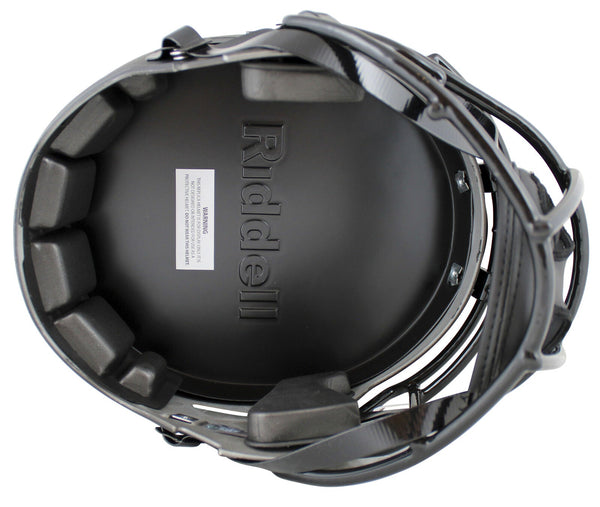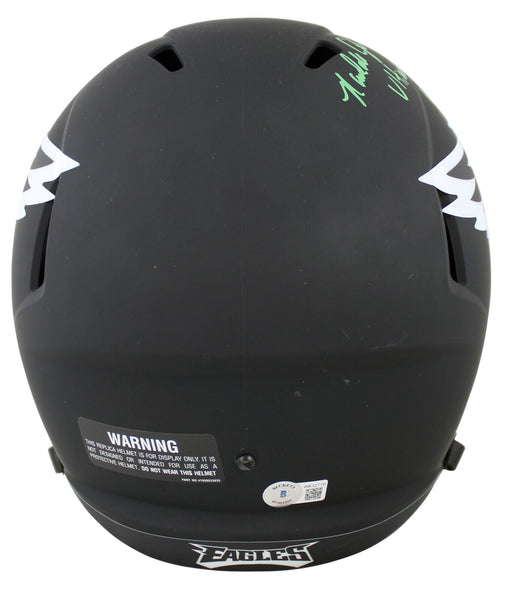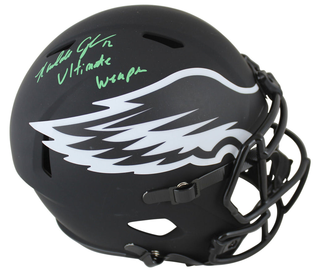 This Autographed Alternate Eclipse Riddell Full Size Speed Rep Helmet with the inscription of "Ultimate Weapon" has been Personally Signed by Randall Cunningham of the Philadelphia Eagles. This item is 100% Authentic to include a hologram by Beckett Authentication Services. This item will come with the new Beckett Authentication hologram that has a scannable QR code rather than the traditional COA. If you would like to have a COA, you are welcome to reach out to Beckett for a printed certification once you receive your item. This is a BAS Witnessed Protection Program item which means a Beckett Authentication Service representative was present when this item was being signed. This is a stock item. We conducted an autograph signing with Randall Cunningham and we have several of these available. The one you will receive will be of equal quality to the one pictured. This item can be verified through BAS Witnessed.